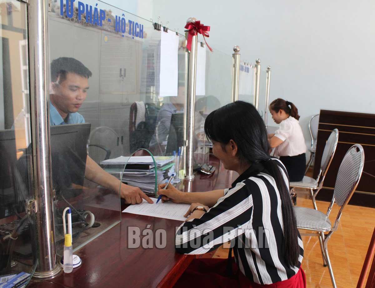 Cán bộ Bộ phận Tiếp nhận và Trả kết quả xã Hợp Phong (Cao Phong) tạo điều kiện hỗ trợ người dân đến làm thủ tục hành chính.
