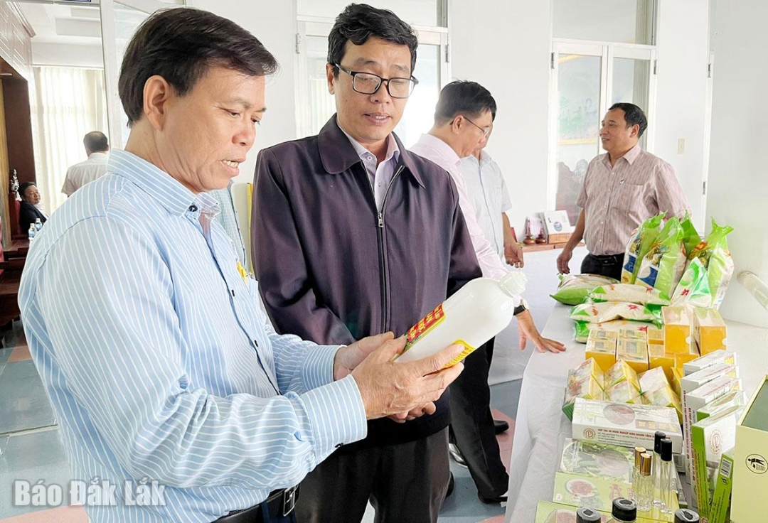 | Ông Nguyễn Hoàng Chương (thứ hai từ trái qua) giới thiệu khách hàng về các sản phẩm của hợp tác xã. |