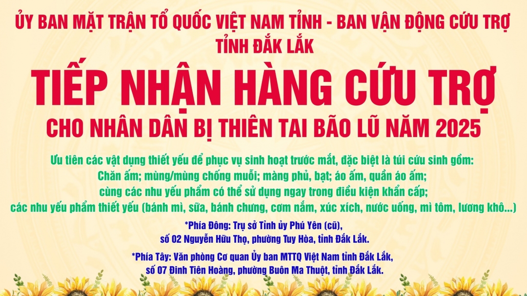 2. Ủng hộ bằng tiền mặt tại Văn phòng Ủy ban MTTQ Việt Nam tỉnh Đắk Lắk, số 07 Đinh Tiên Hoàng, phường Buôn Ma Thuột, tỉnh Đắk Lắk.