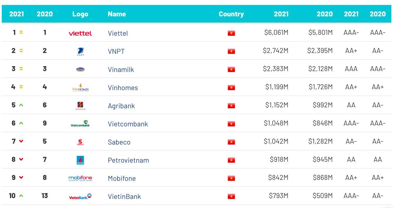 Tại bảng xếp hạng 2021 (brandirectory.com/rankings/vietnam), thương hiệu của Viettel có giá trị gấp 2,2 lần thương hiệu đứng thứ 2 và tương đương tổng giá trị của 3 thương hiệu ở vị trí được xếp liền sau.