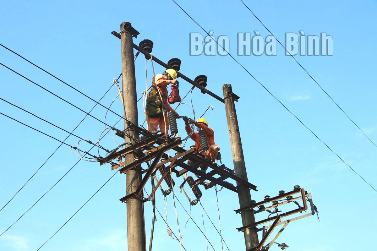 PC Hòa Bình tăng cường công tác kiểm tra, bảo trì hạ tầng lưới điện nhằm kịp thời xử lý, ngăn ngừa sự cố điện. Ảnh chụp trên địa bàn huyện Kim Bôi.