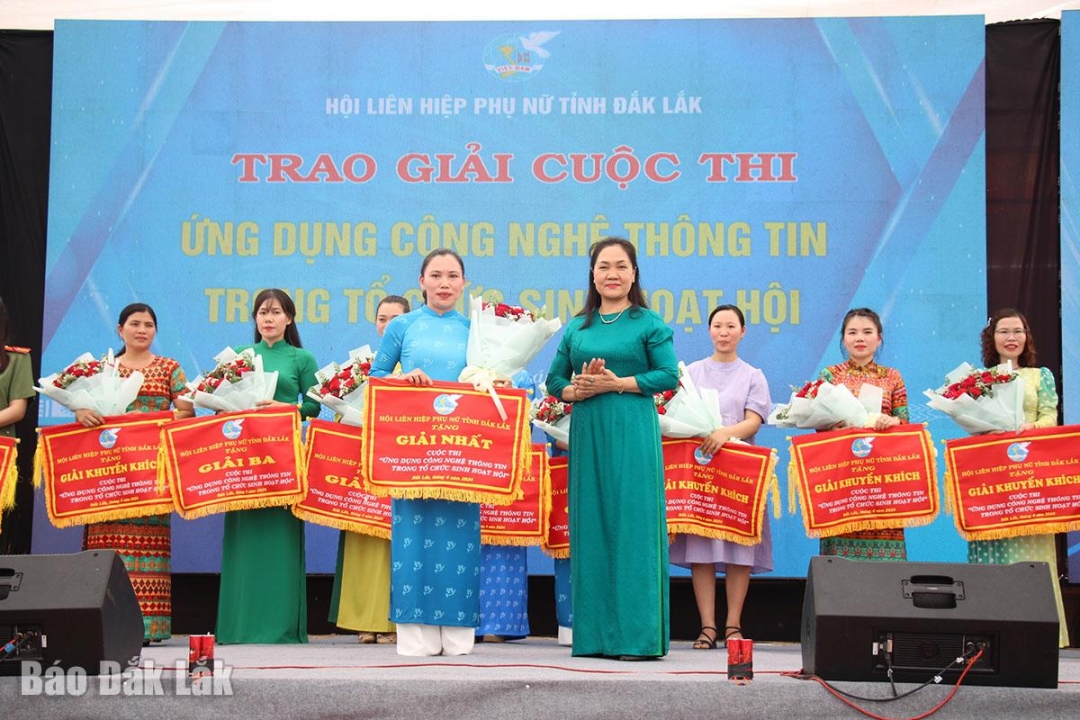 | Đại diện Hội LHPN tỉnh trao giải cho các tập thể, cá nhân xuất sắc trong Cuộc thi "Ứng dụng công nghệ thông tin trong tổ chức sinh hoạt Hội" cấp tỉnh năm 2024. |