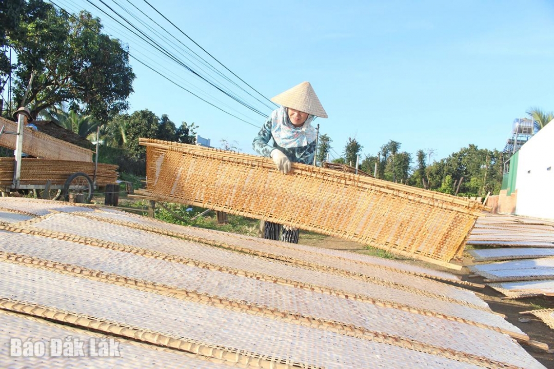 Ở các làng nghề bánh tráng xã Ea Bar, từ sáng sớm đến tối khuya, hàng trăm lò bánh tráng luôn đỏ lửa, mùi thơm của gạo mới, mè rang lan tỏa trong không gian, hơi nước bốc lên nghi ngút, nhịp tráng - phơi - đóng gói diễn ra liên tục. Bà Nguyễn Thị Xuân Hoa (thôn 7, xã Ea Bar) chia sẻ: “Ngày thường, gia đình tôi chỉ tráng khoảng 100 kg gạo nhưng vào mùa Tết, sản lượng tăng lên gấp đôi, gấp ba lần mới đủ đáp ứng nhu cầu. Dự kiến trong tháng Chạp năm nay, cơ sở sẽ xuất xưởng khoảng 8 tấn bánh tráng”.