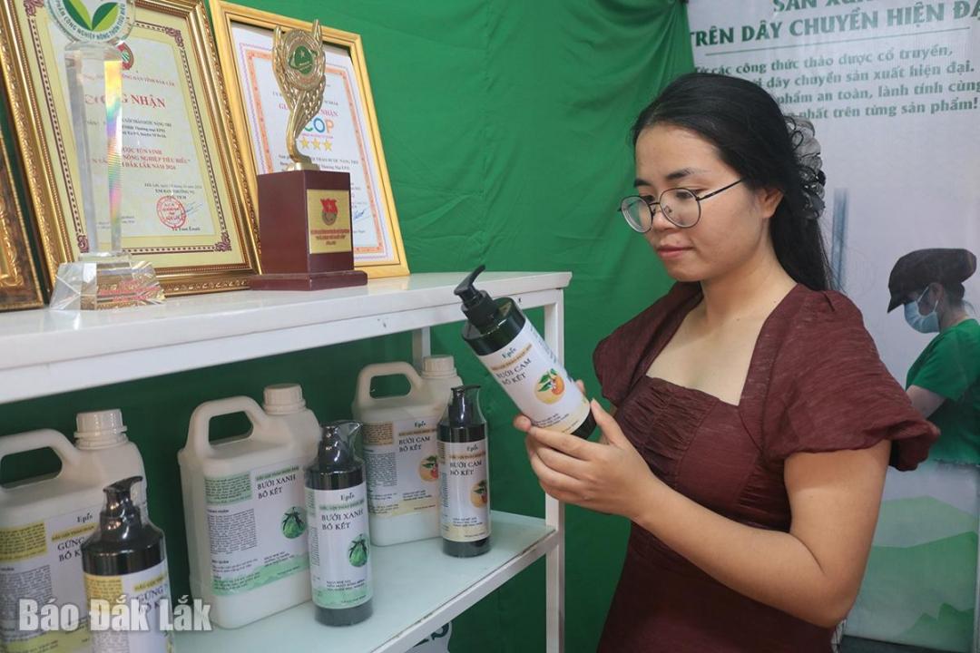Chị Lê Thị Thư, Giám đốc điều hành Công ty TNHH Sản xuất và Thương mại thảo dược Epis giới thiệu về sản phẩm dầu gội thảo dược. |