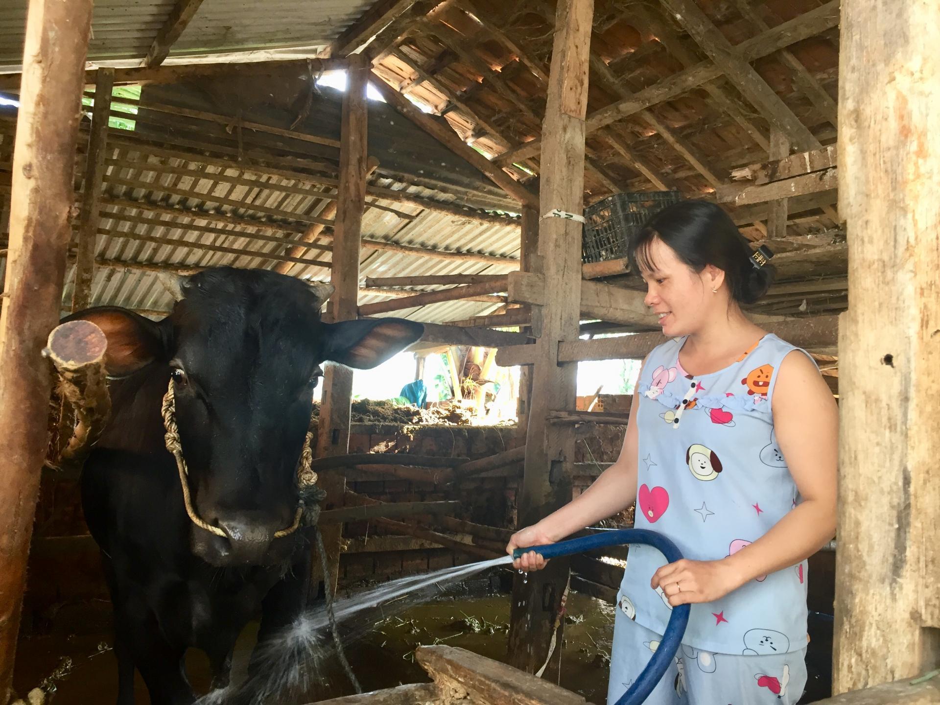 Chị Đinh Thị Kim Trinh đang chăm sóc đàn bò 3B của gia đình. |