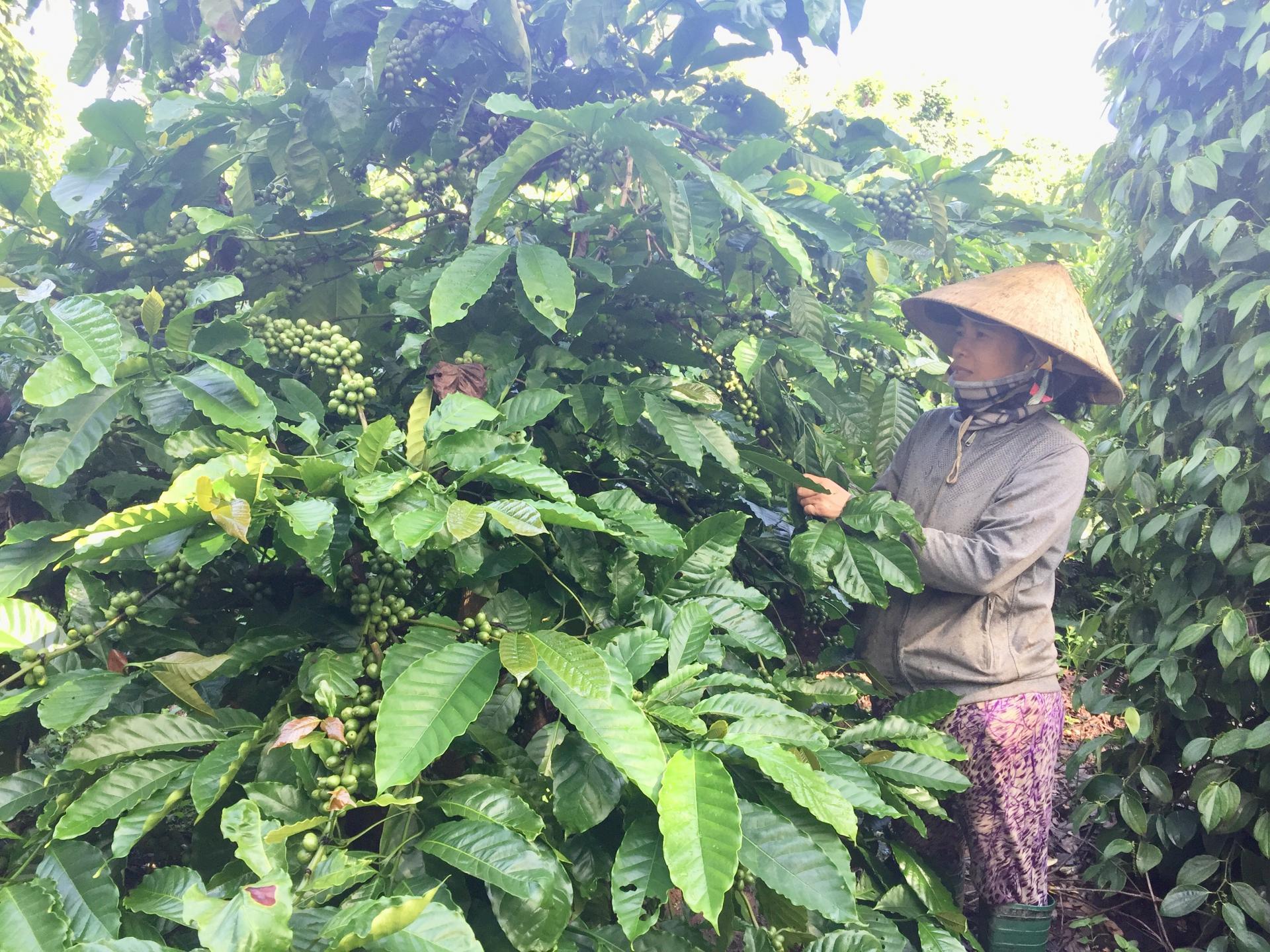 Còn gia đình chị Nguyễn Thị Tuyền (thôn 1) thì có thu nhập ổn định từ mô hình trồng xen canh tiêu - cà phê. Trước đây, khi trồng độc canh cà phê, mỗi năm chị lãi khoảng 40 triệu đồng/ha cà phê. Từ năm 2018, chị bắt đầu trồng xen canh thêm tiêu trong vườn cà phê. Sau 4 năm triển khai, hiện cây tiêu đã bắt đầu cho thu hoạch. Chị tính toán hiện nay thu nhập từ tiêu và cà phê mang lại cho chị nguồn thu nhập 70 triệu đồng/ha; tăng gần gấp đôi so với độc canh cà phê. Mặt khác, trồng xen canh còn giúp gia đình chị đỡ tốn công chăm sóc, giảm chi phí phân bón từ 10 - 15%.