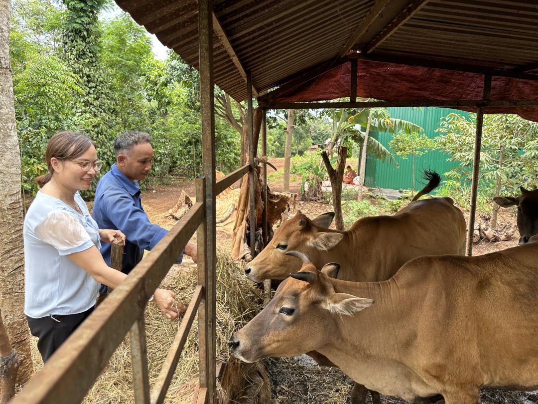 Cán bộ xã Ea Drơng đến thăm mô hình nuôi bò của gia đình anh Y Hen Niê. |