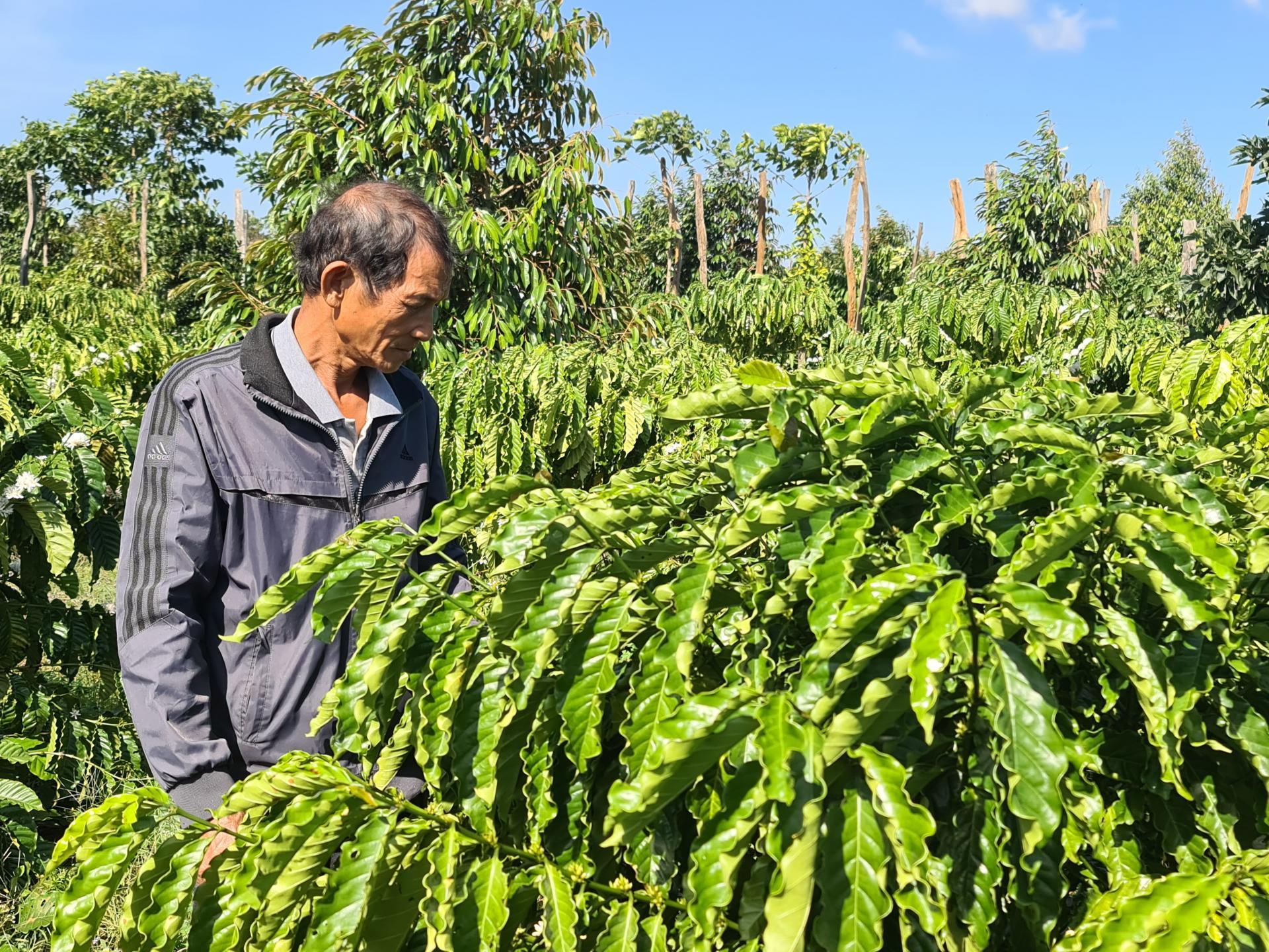 | Ông Thành kiểm tra vườn cà phê tái canh giống mới. |