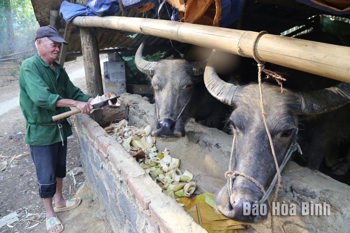 Sau thời gian chăn thả trên đồi, ông Lò Văn Ộn, xóm Cang, xã Đoàn Kết (Đà Bắc) chăm sóc đàn trâu tại chuồng để phát triển tốt.