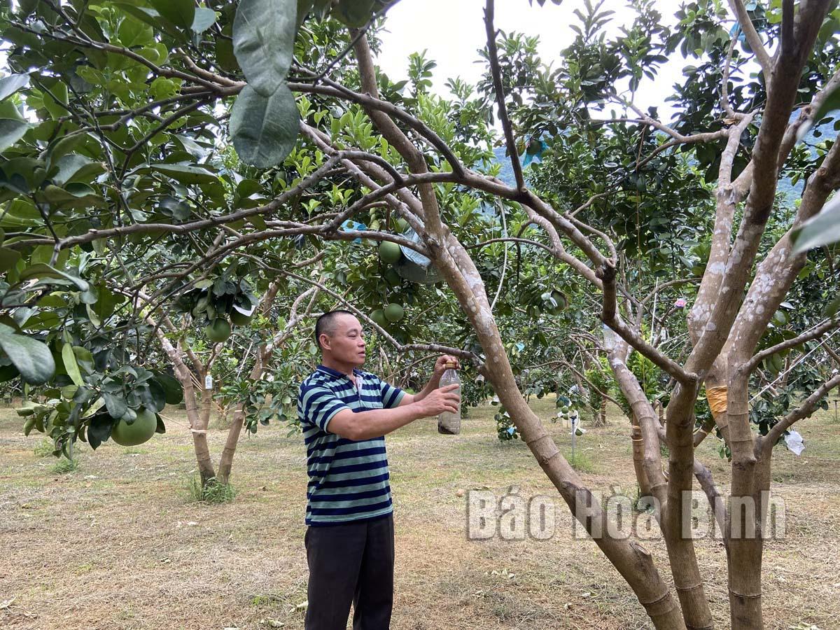 Nông dân xã Ngọc Lương (Yên Thủy) trồng, chăm sóc bưởi theo phương pháp hữu cơ.