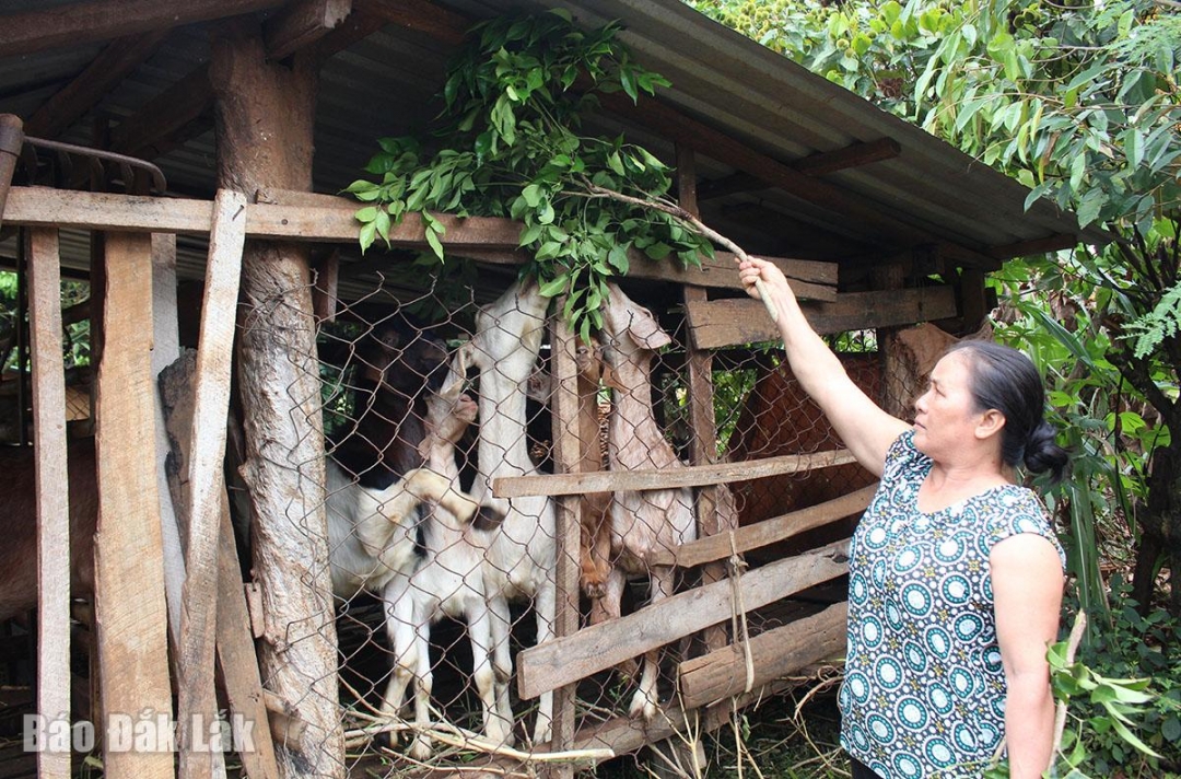 | Chị H Xanh Ê Căm (buôn Yă Wăm B) chăm sóc đàn dê do xã hỗ trợ, giúp gia đình tái sinh kế. |