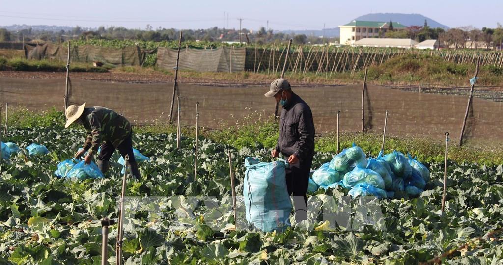 Nông dân Gia Lai thu hoạch rau bắp cải. Ảnh: TTXVN |
