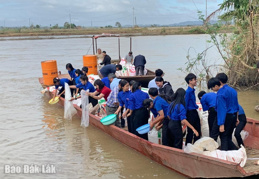 | Lực lượng đoàn viên thanh niên và người dân cùng tham gia thả cá giống ra sông Krông Ana. |