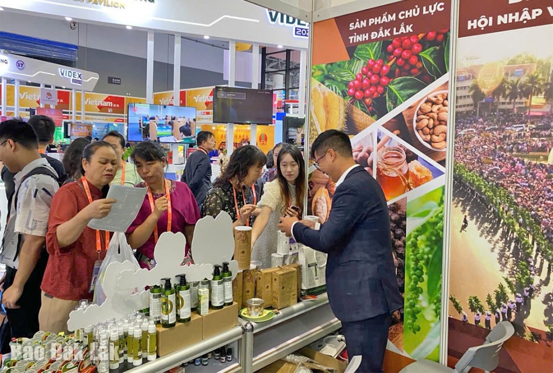 | Sản phẩm công nghiệp nông thôn tiêu biểu tỉnh Đắk Lắk tham gia một sự kiện xúc tiến thương mại quốc tế. Ảnh: Nguyên Phương |
