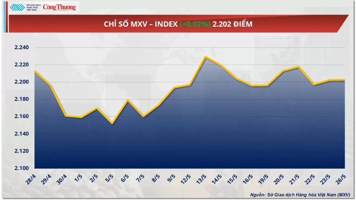 Sở Giao dịch Hàng hóa Việt Nam (MXV) cho biết thị trường hàng hóa nguyên liệu thế giới diễn biến tương đối trầm lắng khi thị trường Mỹ và Anh đóng cửa nghỉ lễ. Chốt phiên giao dịch ngày đầu tuần, chỉ số MXV-Index đi ngang quanh mức 2.202 điểm. Trên thị trường năng lượng, giá hai mặt hàng dầu thô biến động trong biên độ hẹp. Trong khi đó, giá cao su ghi nhận diễn biến trái chiều trên hai sàn Osaka và Singapore.