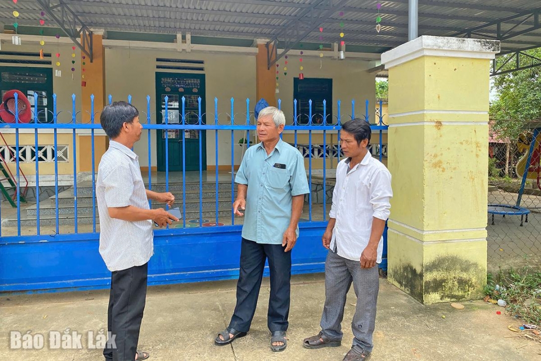 Ma Nít (giữa) chia sẻ kinh nghiệm sản xuất và cải thiện môi trường sống với người dân trong buôn |