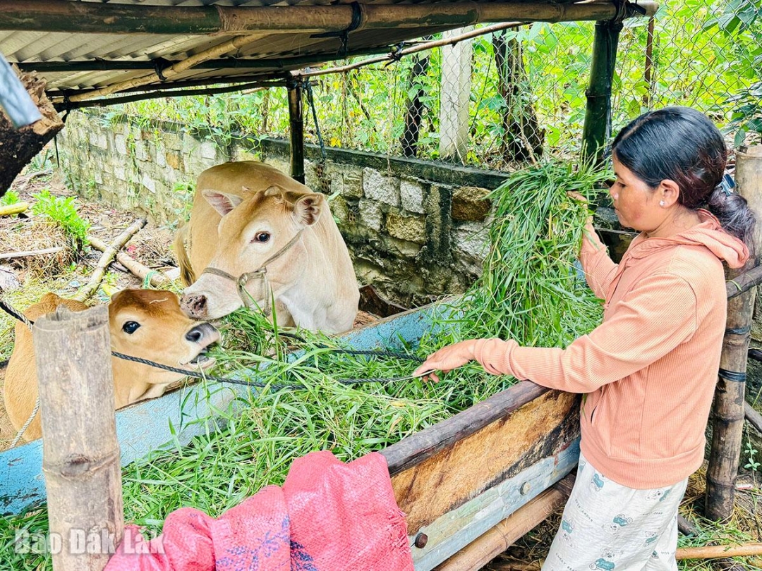 Chị Ksor Hờ Lon chăm sóc bò được chính quyền xã hỗ trợ để phát triển kinh tế. |