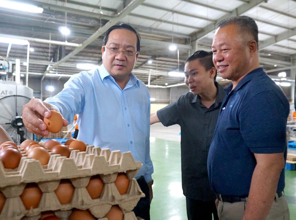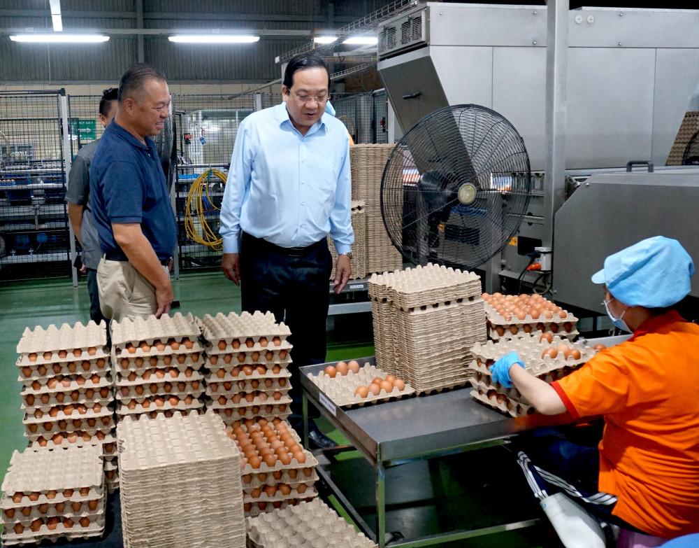 Tại xã Trà Vong, Đoàn công tác đến thăm dây chuyền sản xuất trứng gà xuất khẩu của QL Vietnam Agroresources thuộc Công ty TNHH QL Farms, doanh nghiệp 100% vốn đầu tư từ Tập đoàn QL Resources (Malaysia).