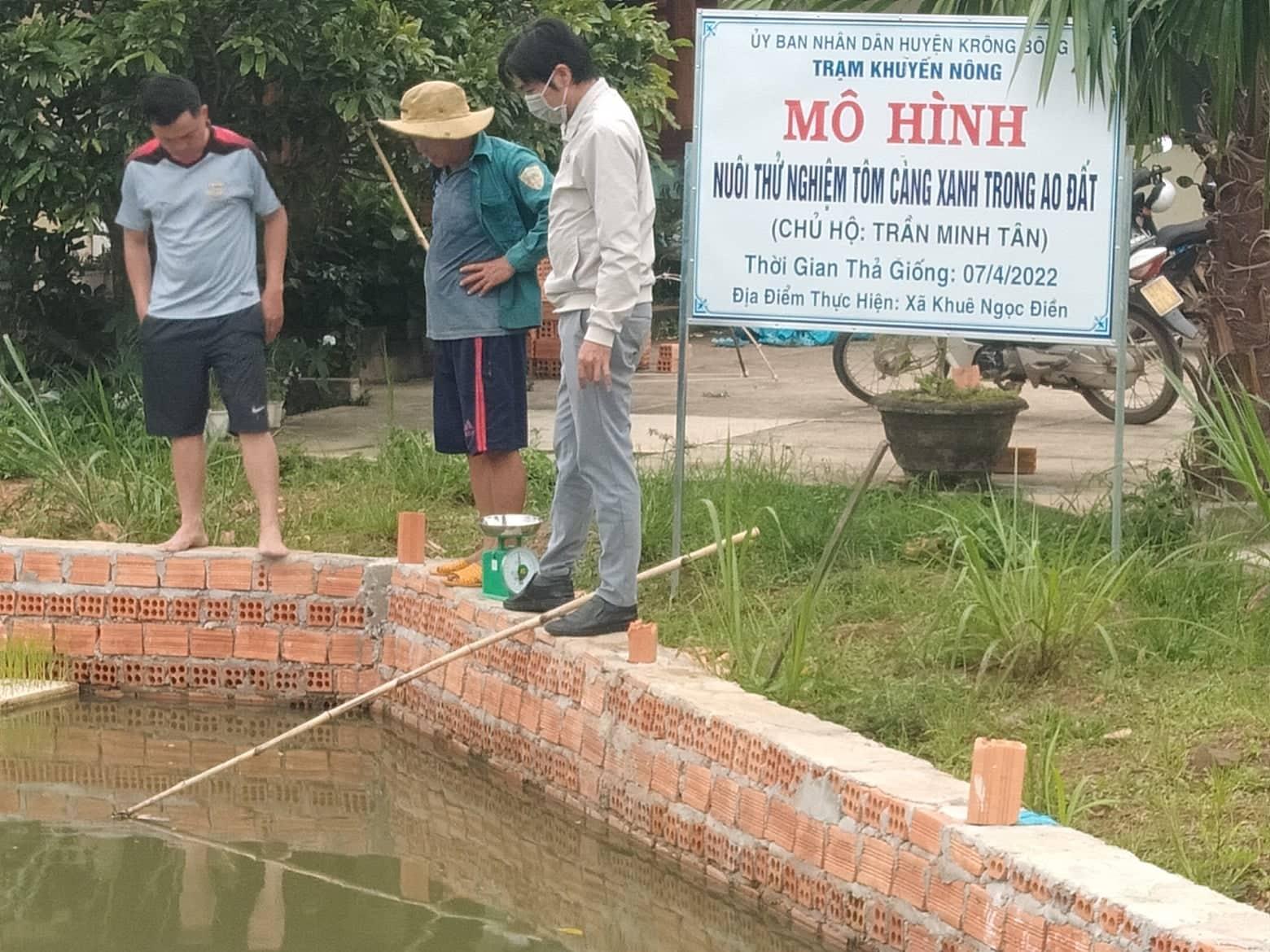 Dự án nuôi tôm càng xanh do Trạm Khuyến nông huyện Krông Bông triển khai thực hiện ở hai xã Hòa Lễ và Khuê Ngọc Điền có 3 hộ tham gia với diện tích 2.400 m2. Người dân tham gia mô hình được hỗ trợ 100% con giống, 70% thức ăn và được hướng dẫn, tư vấn về kỹ thuật trong suốt quá trình nuôi.