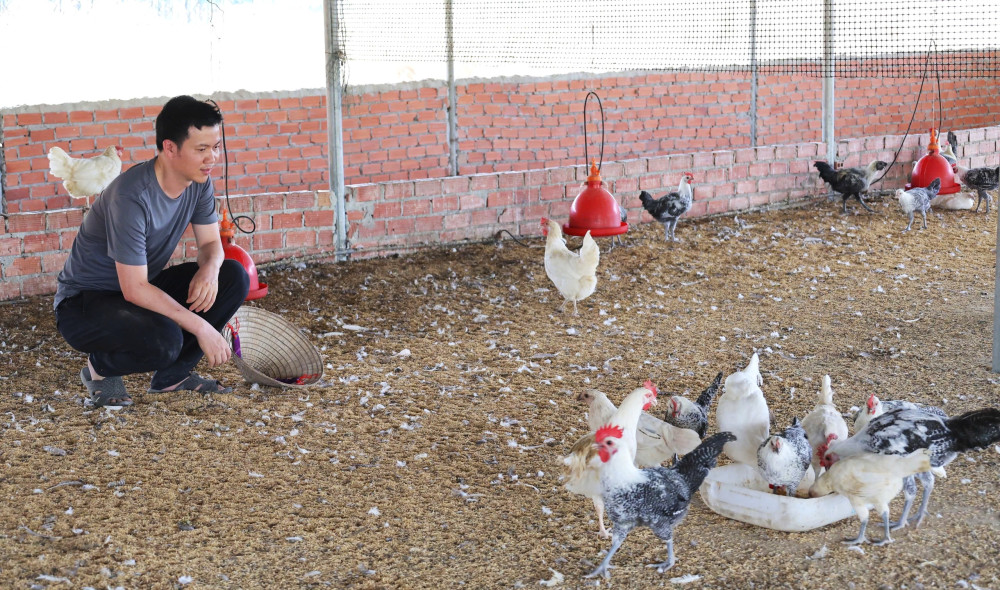 Hệ thống chuồng trại của anh Phong được xây dựng khoa học, thoáng mát, tích hợp hệ thống nước uống tự động sử dụng nguồn nước sạch kết hợp men vi sinh. Quy trình tiêm vắc-xin cũng được thực hiện đầy đủ theo đúng độ tuổi của gà. Sự tỉ mỉ trong từng công đoạn chăm sóc không chỉ giúp nâng cao năng suất mà còn tiết kiệm đáng kể chi phí thuốc men, kháng sinh - vốn là gánh nặng trong chăn nuôi truyền thống.