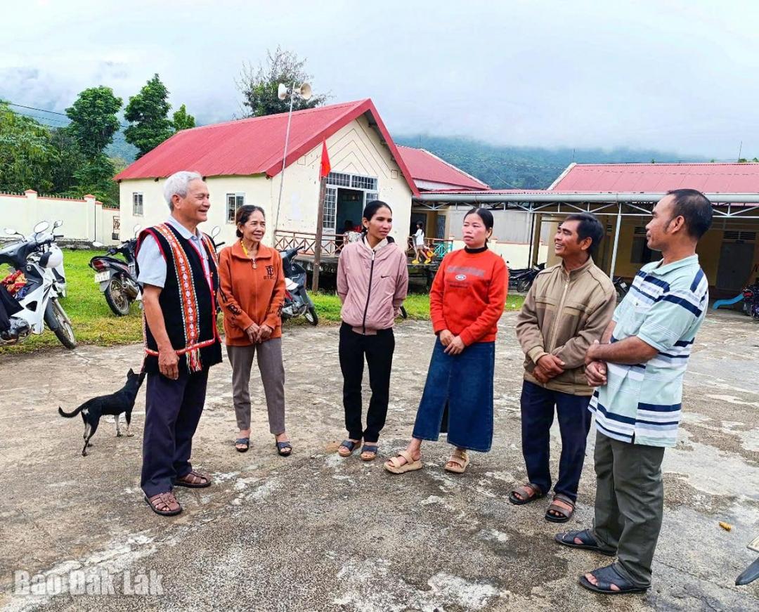 | Ông Rmah In (bìa trái, buôn Ja, xã Hòa Sơn) tích cực tuyên truyền, vận động người dân bảo tồn và phát huy giá trị truyền thống gắn với du lịch sinh thái của buôn. |