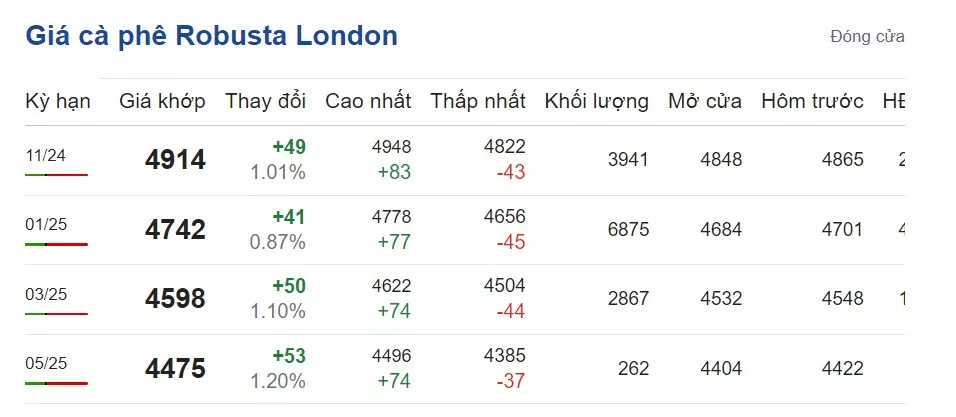 Kết thúc phiên giao dịch, giá cà phê Robusta trên sàn London ngày 11/10/2024 lúc 4h30 giao dịch ở mức 4.475 - 4.914 tấn. Cụ thể, kỳ hạn giao hàng tháng 11/2024 là 4.914 USD/tấn, tăng 49 USD/tấn; kỳ hạn giao hàng tháng 1/2025 là 4.742 USD/tấn, tăng 41 USD/tấn; kỳ hạn giao hàng tháng 3/2025 là 4.598 USD/tấn, tăng 50 USD/tấn và kỳ hạn giao hàng tháng 5/2025 là 4.475 USD/tấn, tăng 53 USD/tấn.