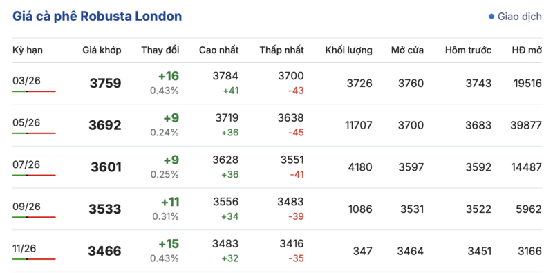 Kết thúc phiên giao dịch gần nhất, giá cà phê Robusta tại London đảo chiều tăng nhẹ đồng loạt trong các kỳ giao hàng. Cụ thể, kỳ giao tháng 1/2026 tăng 16 USD/tấn, đạt mức 3759 USD/tấn. Trong khi đó, hợp đồng giao kỳ hạn tháng 11/2026 cũng tăng nhẹ 15 USD/tấn, đạt mức 3466 USD/tấn.