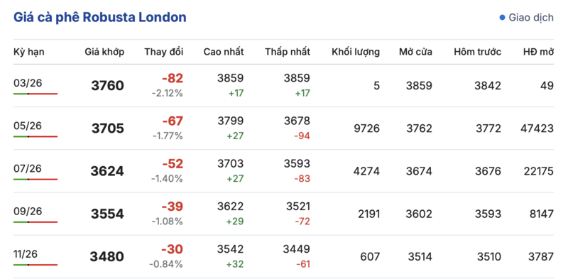 Cụ thể, kết thúc phiên giao dịch gần nhất, giá cà phê Robusta tại London ghi nhận phiên giảm nhẹ đồng loạt trong các kỳ giao hàng. Trong đó, kỳ giao tháng 1/2026 giảm mạnh 82 USD/tấn, đạt mức 3760 USD/tấn. Hợp đồng giao kỳ hạn tháng 11/2026 cũng giảm nhẹ 30 USD/tấn, xuống mức 3480 USD/tấn.