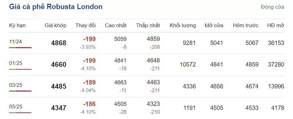 Kết thúc phiên giao dịch, giá cà phê Robusta trên sàn London ngày 8/10/2024 lúc 4h30 giao dịch ở mức 4.347 - 4.868 tấn. Cụ thể, kỳ hạn giao hàng tháng 11/2024 là 4.868 USD/tấn, giảm 199 USD/tấn; kỳ hạn giao hàng tháng 1/2025 là 4.660 USD/tấn, giảm 199 USD/tấn; kỳ hạn giao hàng tháng 3/2025 là 4.485 USD/tấn, giảm 189 USD/tấn và kỳ hạn giao hàng tháng 5/2025 là 4.347 USD/tấn, giảm 186 USD/tấn.