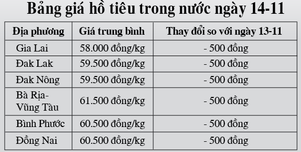 Theo thông tin từ Báo Công thương, trang thông tin điện tử tổng hợp vietnambiz.vn, website giatieu.com, giá hồ tiêu trong nước ngày 14-11 giảm nhẹ tại các vùng trồng trọng điểm trên cả nước.