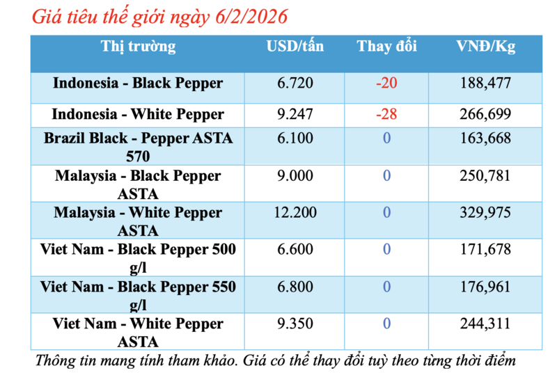 Cập nhật giá tiêu thế giới từ Hiệp hội Hồ tiêu Quốc tế (IPC) sáng 6/2/2026, hồ tiêu xuất khẩu hôm nay tiếp tục ghi nhận biến động mới từ thị trường Indonesia. Các thị trường khác đều duy trì mức giá ổn định so với phiên giao dịch hôm qua.