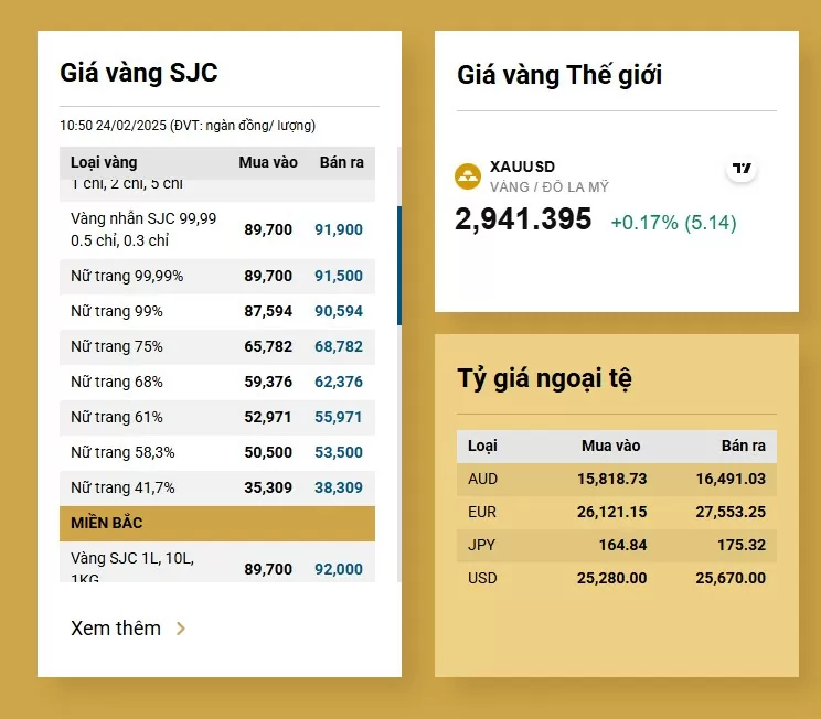 Giá vàng hôm nay ngày 24/2, lúc 16h giá vàng thế giới tăng lên 2.941 USD/ounce, tương đương với mức trên 91 triệu đồng/lượng. Giá vàng thế giới tăng đã kéo giá vàng trong nước đi lên.