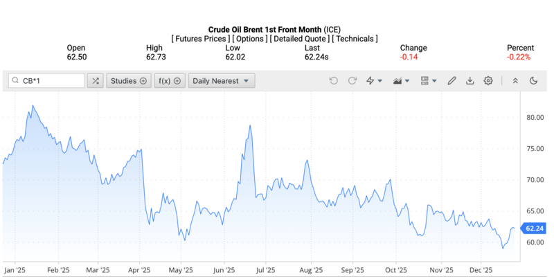 Giá dầu Brent trên thị trường thế giới rạng sáng ngày 26/12/2025 (theo giờ Việt Nam). Nguồn: Oilprice.
