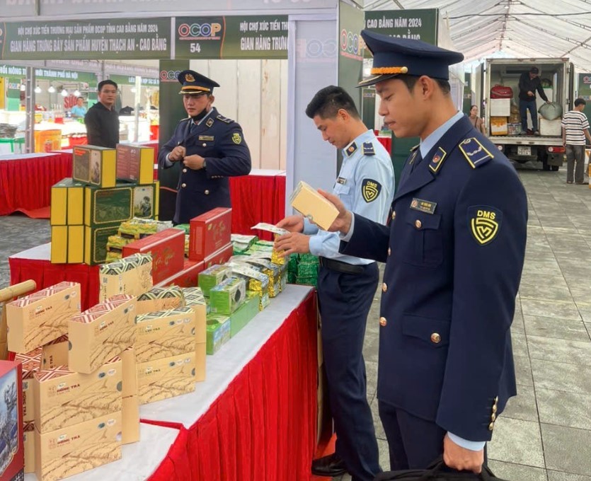Tại Quảng trường Trung tâm hội nghị Km5, phường Đề Thám, thành phố Cao Bằng, tỉnh Cao Bằng, Đội Quản lý thị trường số 1 phối hợp với Đội Quản lý thị thị trường số 5 thuộc Cục Quản lý thị trường tỉnh Cao Bằng tiến hành tuyên truyền pháp luật, giám sát, kiểm tra Hội chợ xúc tiến thương mại OCOP tỉnh Cao Bằng năm 2024; với 50 gian hàng sản phẩm OCOP của tỉnh Cao Bằng, 70 gian hàng sản phẩm OCOP của các tỉnh, thành phố đăng ký tham gia và 120 gian hàng thương mại.