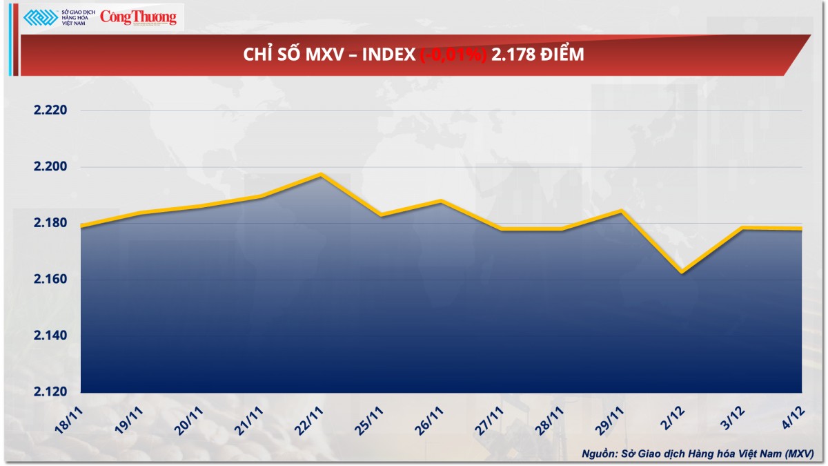 Sở Giao dịch Hàng hóa Việt Nam (MXV) cho biết, thị trường hàng hóa nguyên liệu thế giới diễn biến trái chiều trong phiên giao dịch ngày hôm qua (4/12). Đóng cửa, chỉ số MXV-Index gần như không thay đổi, vẫn dừng ở mức 2.178 điểm. Hai mặt hàng cà phê tiếp tục gây chú ý trên thị trường nguyên liệu công nghiệp khi quay đầu bật tăng 3% sau ba phiên trượt dốc trước đó. Ngược lại, trên thị trường năng lượng, sau khi nhận những thông tin không mấy khả quan về nền kinh tế Mỹ, giá các mặt hàng dầu thô đồng loại suy yếu.