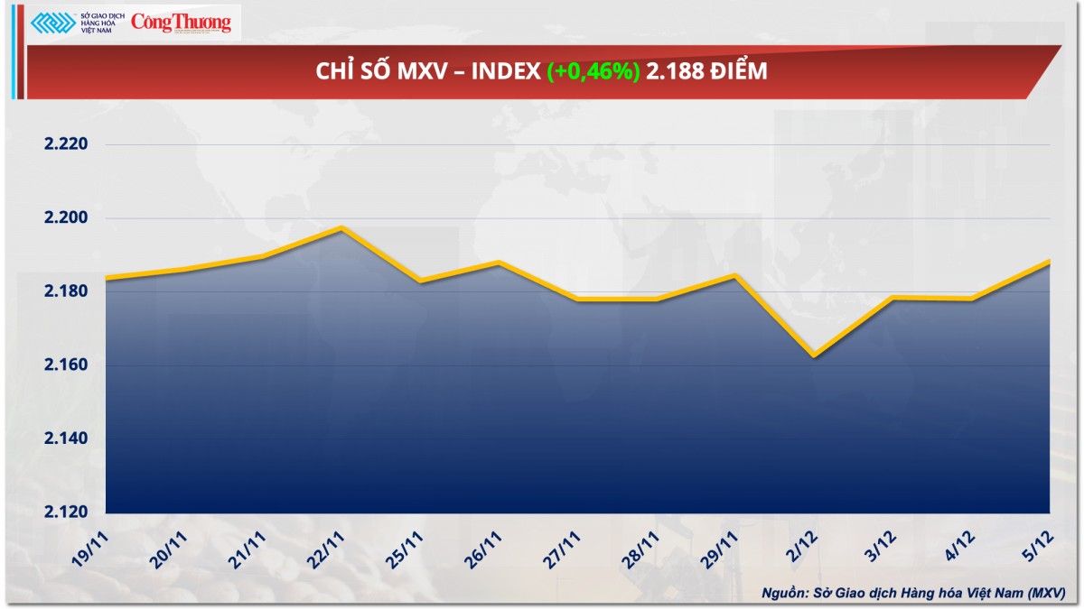 Theo Sở Giao dịch Hàng hóa Việt Nam (MXV), thị trường hàng hóa nguyên liệu thế giới diễn biến phân hóa trong phiên giao dịch ngày hôm qua (5/12). Tuy nhiên, lực mua chiếm ưu thế đã kéo chỉ số MXV-Index tăng 0,46% lên 2.188 điểm. Đáng chú ý, giá hai mặt hàng cà phê Arabica và Robusta nối dài đà tăng sang phiên thứ hai liên tiếp. Đồng thời, sắc xanh cũng bao phủ bảng giá nhóm nông sản khi 6 trên 7 mặt hàng đồng loạt tăng.