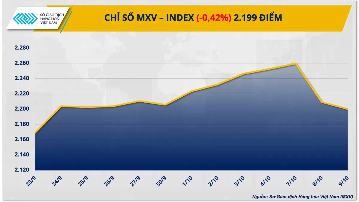 Trong khi toàn bộ các mặt hàng nhóm năng lượng đóng cửa trong sắc đỏ thì thị trường nguyên liệu công nghiệp, nhất là cà phê diễn biến tích cực, giá phục hồi. Đóng cửa, lực bán tiếp tục chiếm ưu thế kéo chỉ số MXV - Index đánh mất 0,42% về mức 2.199 điểm.
