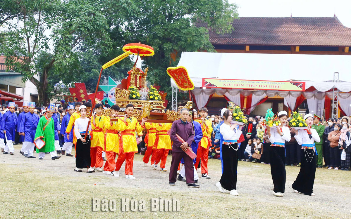 Trang trọng rước kiệu ra sân vận động xã Phong Phú (Tân Lạc) tại Lễ hội Khai hạ dân tộc Mường tỉnh năm 2025.
