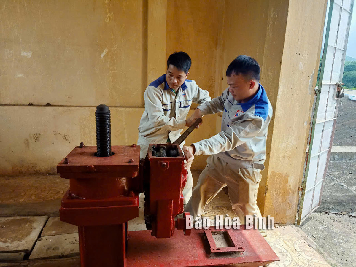 Cán bộ Chi nhánh Công ty TNHH MTV khai thác công trình thủy lợi Hòa Bình tại huyện Lạc Sơn kiểm tra hệ thống bơm tiêu nước công trình hồ Khang Trào, xã Văn Sơn.