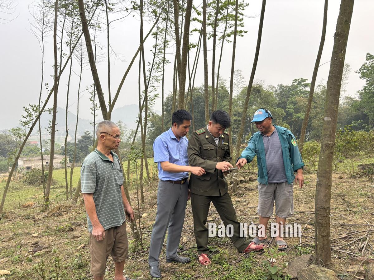 Cán bộ kiểm lâm địa bàn phối hợp kiểm tra biến động rừng tại xã Tú Lý (Đà Bắc) thông qua phần mềm chuyên ngành.