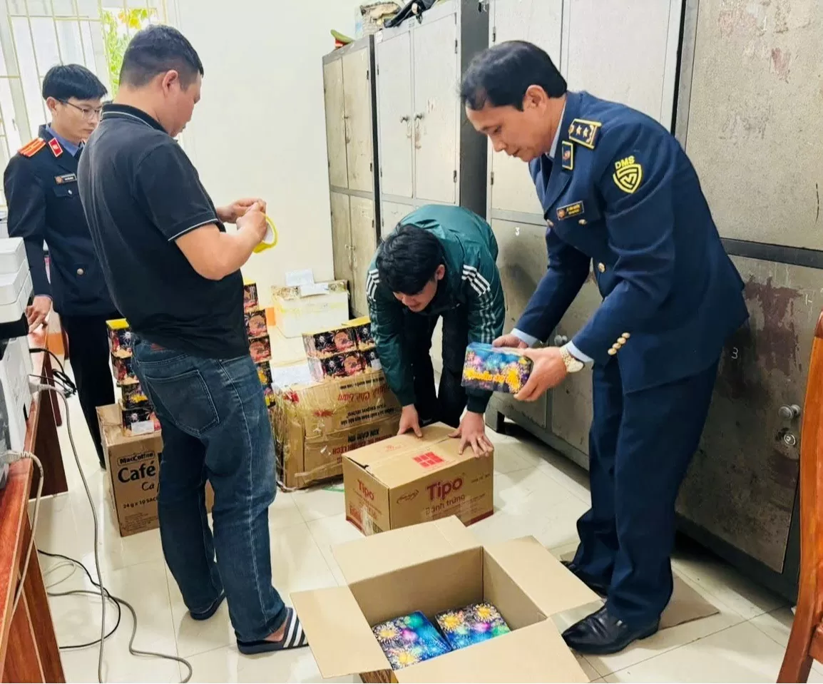 Qua kiểm tra, đoàn kiểm tra phát hiện sau yên xe mô tô có chứa 26 hộp pháo các loại do nước ngoài sản xuất, bên ngoài có hình ảnh pháo hoa nổ với tổng trọng lượng 44,5 kg. Tại thời điểm kiểm tra, chủ phương tiện không có giấy tờ, hóa đơn chứng từ hay hợp đồng chứng minh nguồn gốc hợp pháp của hàng hóa.
