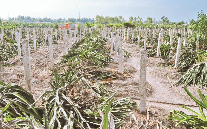 Vườn thanh long ở xã Hàm Chính, huyện Hàm Thuận Bắc (Bình Thuận) bị chặt bỏ.