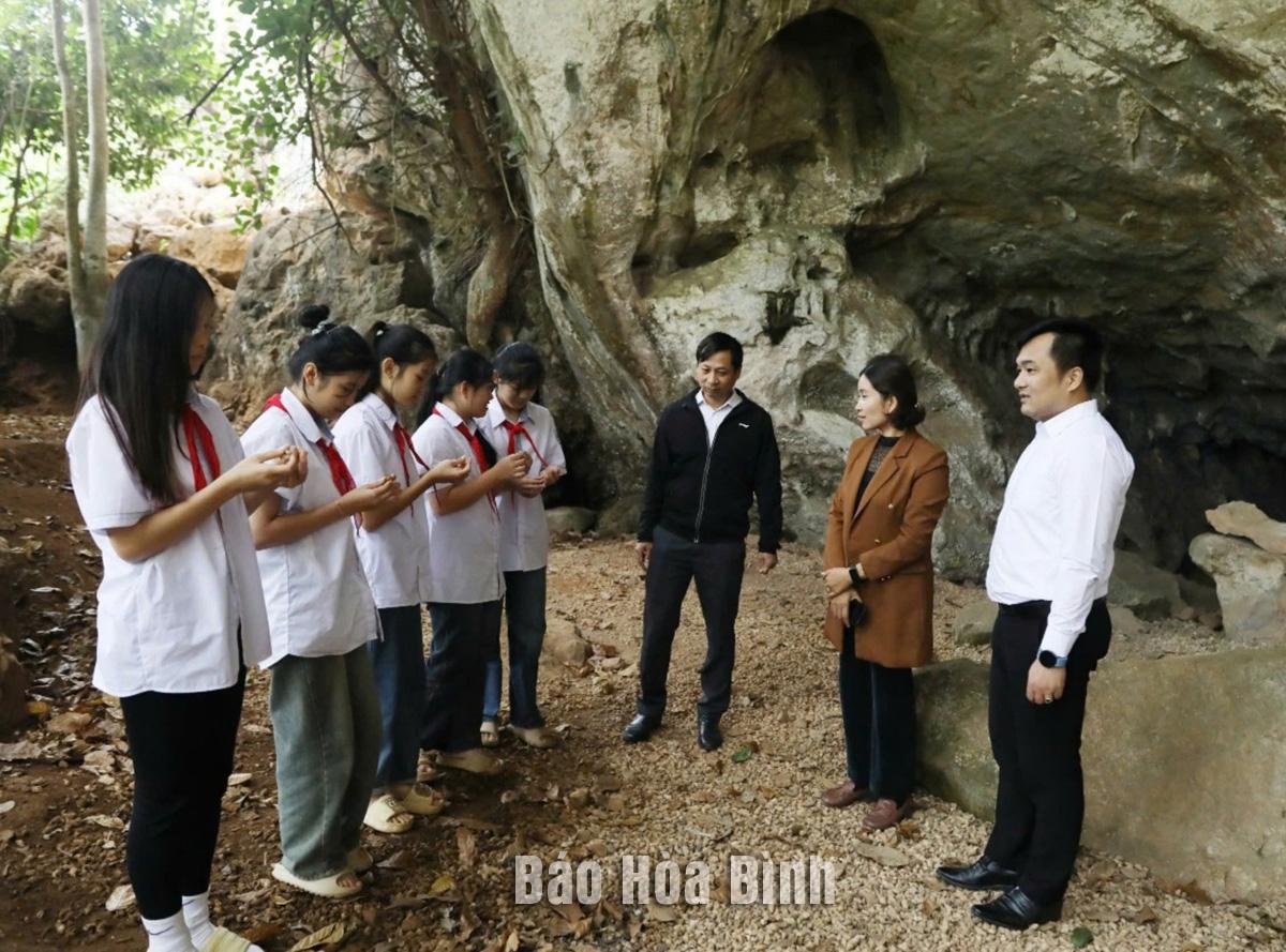 Cán bộ Bảo tàng tỉnh trao đổi về nội dung giá trị di tích quốc gia đặc biệt Mái đá làng Vành với cán bộ và học sinh xã Yên Phú (Lạc Sơn).