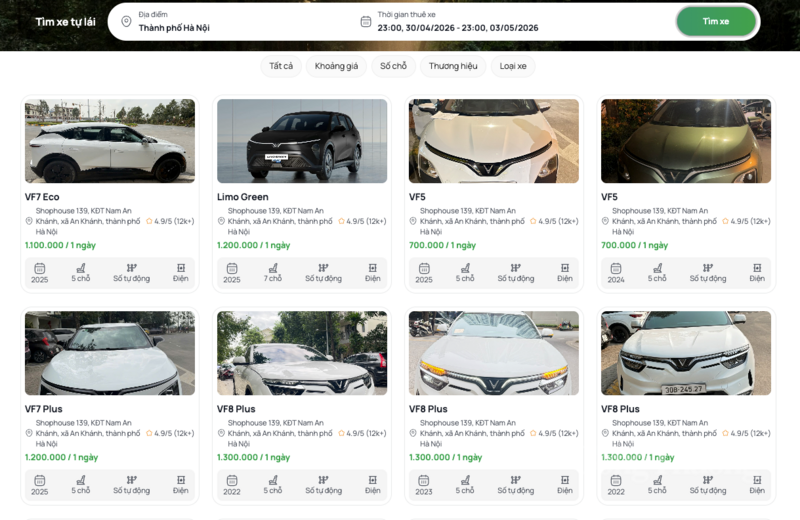 Đa dạng phân khúc xe điện trên các trang web cho thuê xe tự lái (Ảnh chụp màn hình)