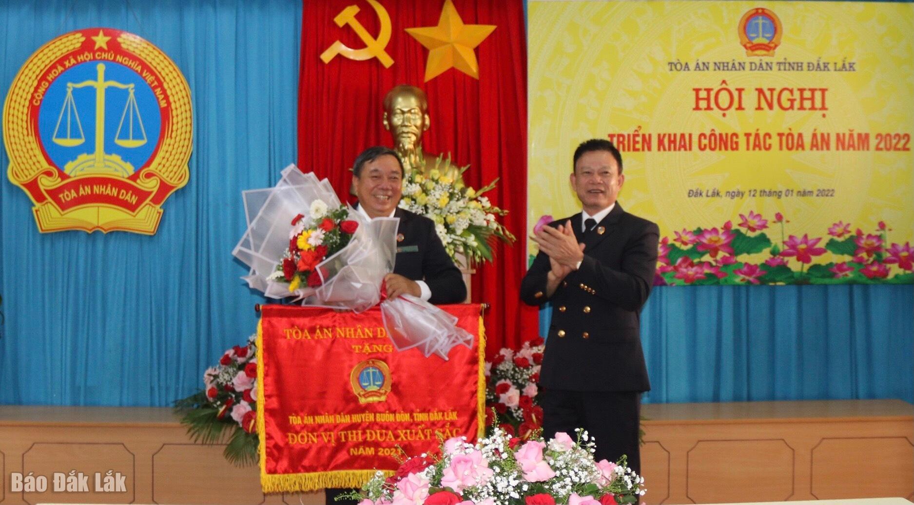 Thừa ủy quyền của Chánh án TAND tối cáo, Chánh án TAND tỉnh Nguyễn Duy Hữu (bìa phải) trao Cờ thi đua xuất sắc cho TAND huyện Buôn Đôn. |