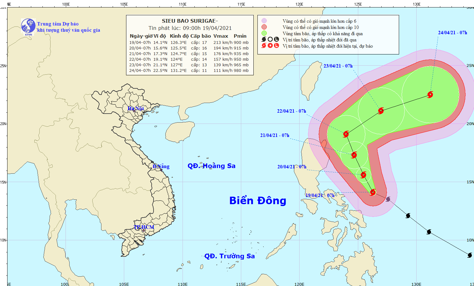 Hồi 7 giờ ngày 19/4, vị trí tâm siêu bão ở vào khoảng 14,1 độ Vĩ Bắc; 126,3 độ Kinh Đông, cách bờ biển miền Trung Philippines khoảng 270 km về phía Đông. Sức gió mạnh nhất vùng gần tâm siêu bão mạnh cấp 17 (200-220 km/giờ), giật trên cấp 17.