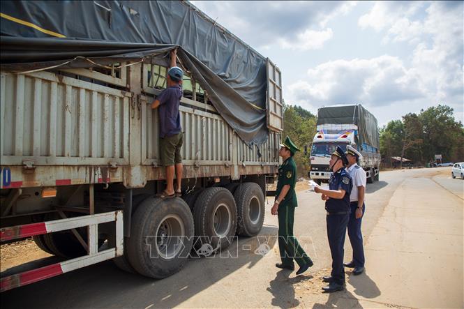 Các lực lượng Bộ đội Biên phòng, Hải quan, Kiểm dịch y tế quốc tế phối hợp kiểm soát hàng hóa qua cửa khẩu quốc tế Tân Nam. Ảnh minh họa: Giang Phương/TTXVN