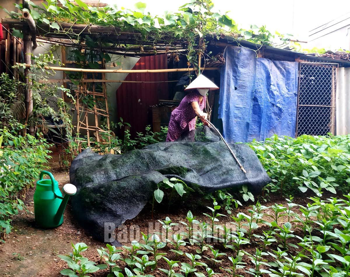 Người dân phường Thống Nhất (TP Hòa Bình) che chắn vườn rau xanh khi thời tiết nắng nóng để bảo vệ sản xuất.