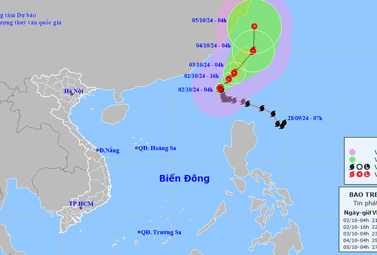 Thông tin về bão số 5, hồi 4 giờ ngày 2/10, vị trí tâm bão ở vào khoảng 21,6 độ Vĩ Bắc; 119,2 độ Kinh Đông, trên vùng biển phía Đông Bắc của khu vực Bắc Biển Đông. Sức gió mạnh nhất vùng gần tâm bão mạnh cấp 14-15 (150-183 km/giờ), giật trên cấp 17; di chuyển theo hướng Tây Tây Bắc, tốc độ khoảng 5 km/giờ.