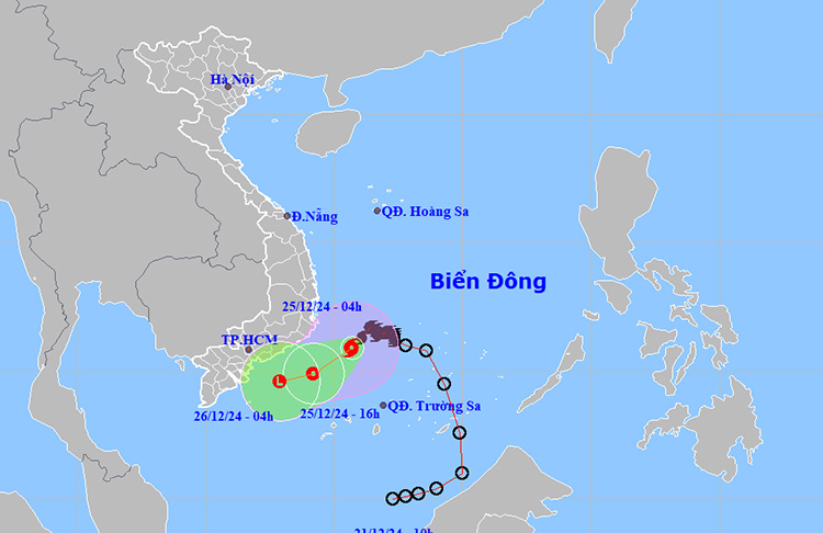 Ngoài ra, ngày và đêm 25/12, ở khu vực giữa Biển Đông và vùng biển phía Tây Bắc khu vực Nam Biển Đông (bao gồm cả vùng biển phía Tây Bắc Trường Sa), từ Quảng Trị đến Bình Thuận có mưa rào và dông. Trong mưa dông có khả năng xảy ra lốc xoáy và gió giật mạnh.